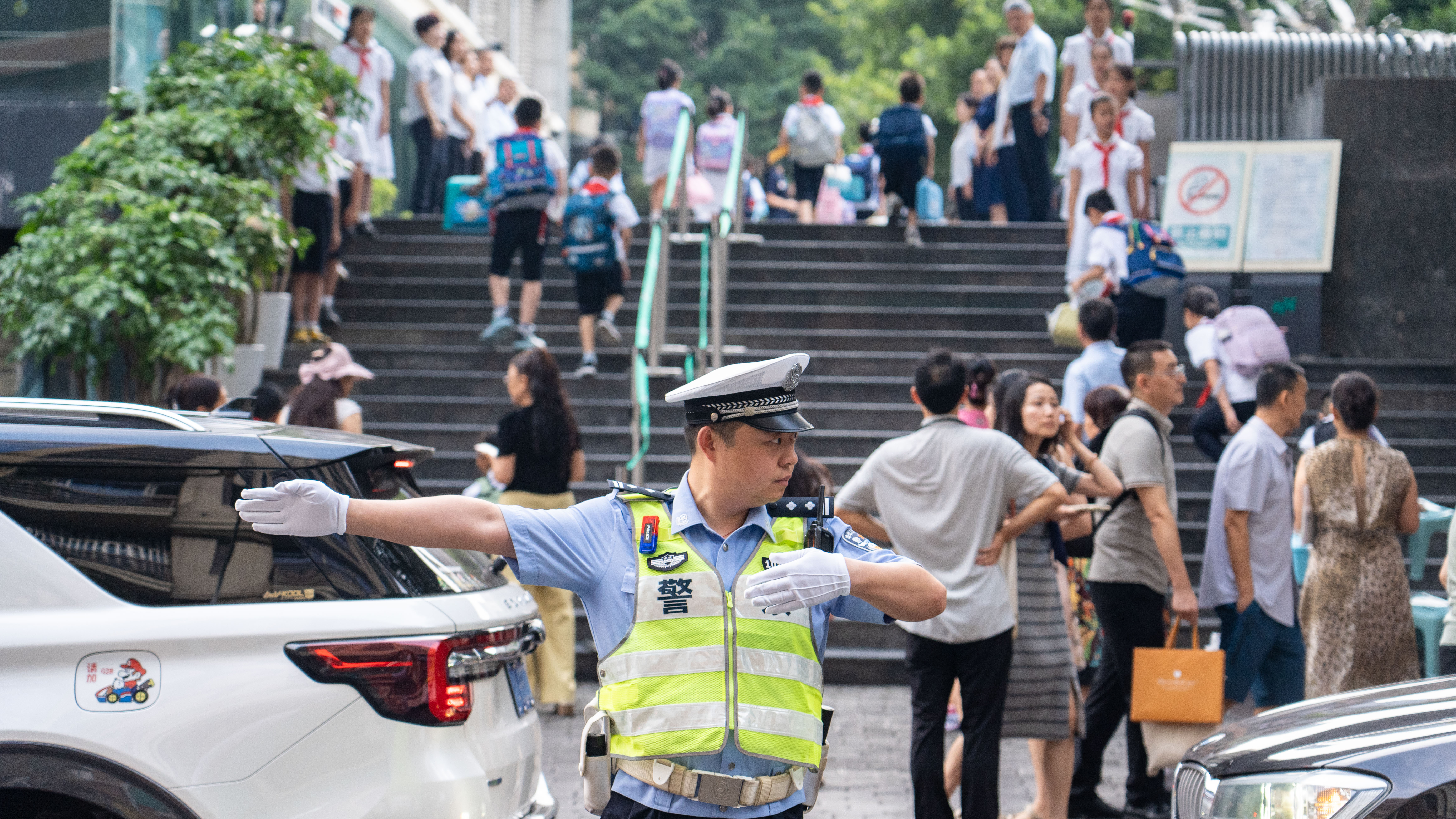 “家长你好,这里只能即停即走,请开往前方临时停车区。”校园外警灯闪烁,“护学岗”民警们耐心引导送学车辆。一位新生家长感激地说:“谢谢警官,第一天送孩子上学,不太熟悉情况。有你们在,我们接送孩子也放心多了。”