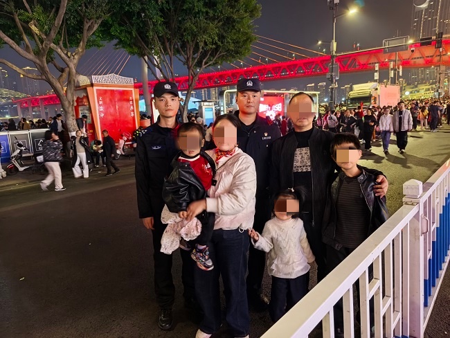18日,特警支队巡逻警力在解放碑执勤时,接到一位母亲紧急求助,称孩子不慎走散。民警立刻扩大巡逻范围,最终在人群中发现了走失孩子,及时将他送到母亲身边。21日,网安支队民警在洪崖洞执勤时,接到群众求助,2岁的儿子在拍照时脱离视线,四处找寻无果。民警立即上报并在人海中细致搜寻,最终成功找到走失男童交到父母手中。23日15时许,解放碑街面警务大队民辅警在碑下巡逻时发现一名走失女童,耐心安抚后,引导其记起家长电话并成功联系,家长赶到后,对民辅警表达诚挚感谢,并主动合影留念。