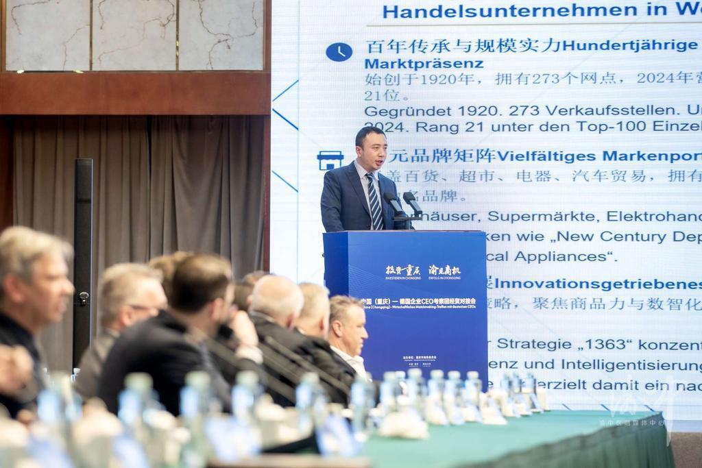 3月18日下午,在“投资重庆·渝见商机”中国(重庆)—德国企业CEO考察团经贸对接会上,渝中的大型商业综合体、零售渠道终端、跨境电商企业纷纷上台,向德国企业推介项目情况及合作意向,通过加强沟通交流、增进双方共识,共谋合作共赢。