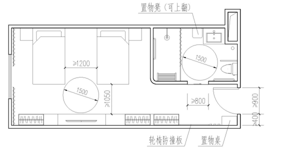 2 居室内应留有轮椅回转空间,主要通道的净宽不宜小于1.05m,床边留有护理、急救操作空间,相邻床位的长边间距不应小于1.20m;