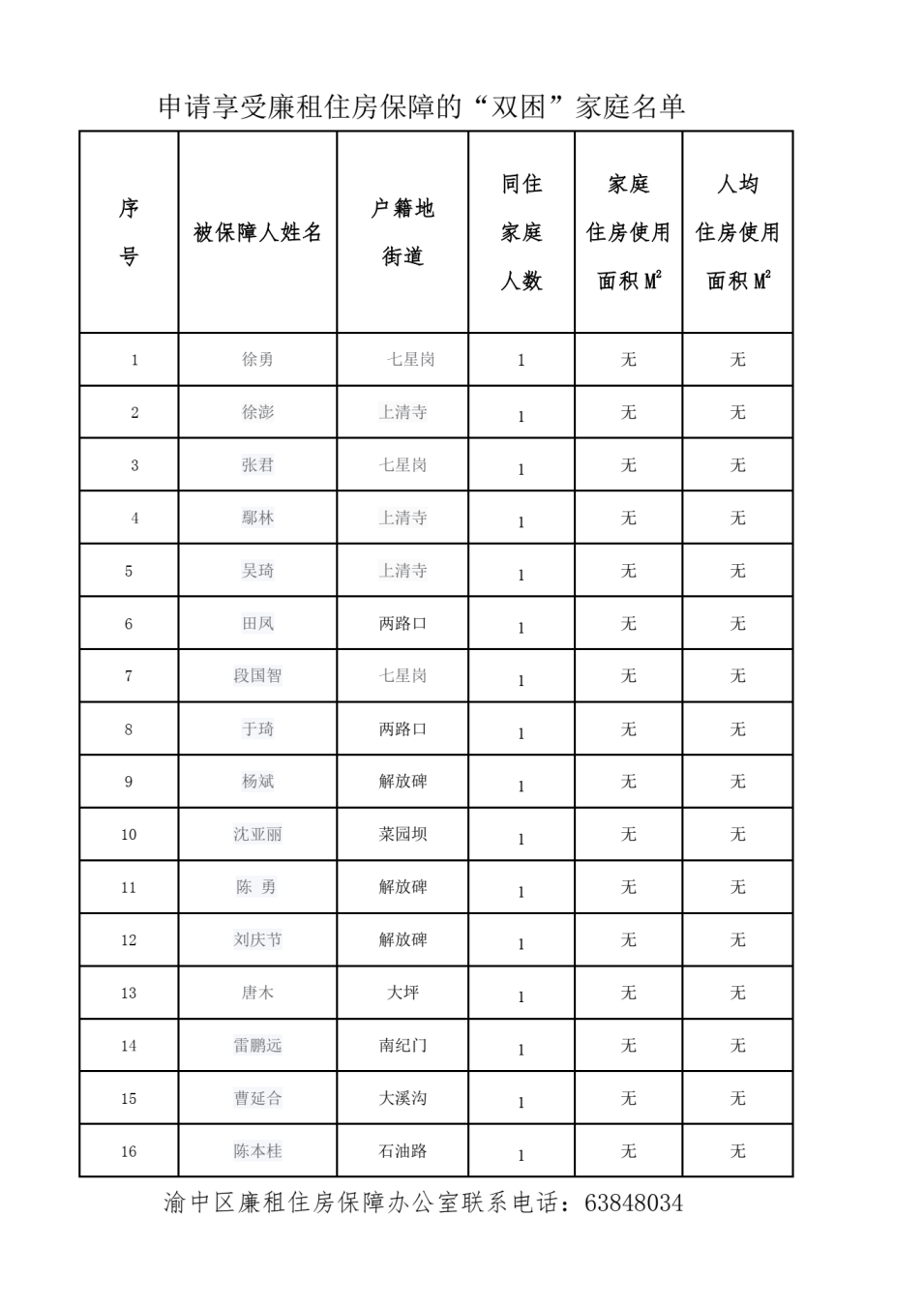 按照重庆市人民政府《重庆市城镇廉租住房保障办法(试行)》和足球下注平台 人民政府的有关规定,根据符合廉租住房保障条件家庭本人的申请,经街道办事处初步调查和评议,足球下注平台 廉租住房保障领导小组办公室审核,现将申请享受城市廉租住房保障的“双困”家庭的基本情况公示如下,公示期五日。请广大居民本着实事求是的原则,公正、准确地反映申请人家庭的情况,若对下列申请人家庭的情况有异议,请在公示期内向足球下注平台 廉租办和当地街道办事处或居民委员会反映,单位反映情况的应加盖公章,个人反映情况应留下真实姓名及联系方式。对调查落实后不符合条件的,将按规定予以清退。