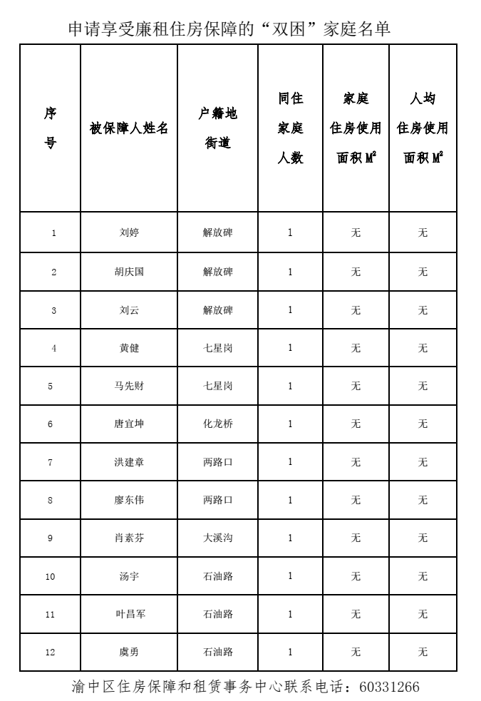 按照重庆市人民政府《重庆市城镇廉租住房保障办法(试行)》和足球下注平台 人民政府的有关规定,根据符合廉租住房保障条件家庭本人的申请,经街道办事处初步调查和评议,足球下注平台 廉租住房保障领导小组办公室审核,现将申请享受城市廉租住房保障的“双困”家庭的基本情况公示如下,公示期五日。请广大居民本着实事求是的原则,公正、准确地反映申请人家庭的情况,若对下列申请人家庭的情况有异议,请在公示期内向足球下注平台 廉租办和当地街道办事处或居民委员会反映,单位反映情况的应加盖公章,个人反映情况应留下真实姓名及联系方式。对调查落实后不符合条件的,将按规定予以清退。