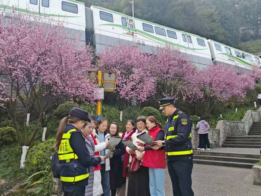 针对半山崖线步道、关岳庙等核心区域,服务队划分3个责任片区,实行“定点值守+机动巡查”模式,开展设施排查、占道整治与禁飞提醒,及时处置绿化损坏、步道松动等问题。同时优化交通指引,在轨道交通9号线化龙桥站2号口设置“赏花捷径”指示牌,标注大化步道电梯运行时间,并联动途经公交发布实时信息,方便市民、游客规划行程。