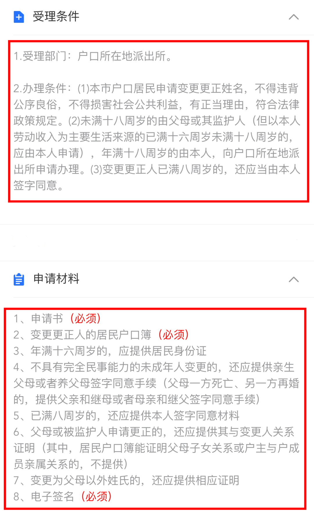 申报前请仔细了解办理变更姓名所要求的“受理条件”,并准备所需的“申请材料”,如下图: