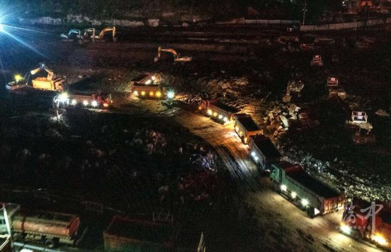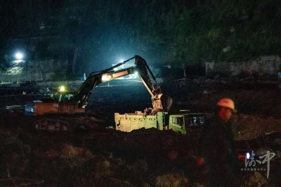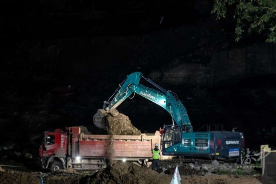 重庆站铁路枢纽及配套工程项目,挖机和渣土车在夜间协同施工作业。