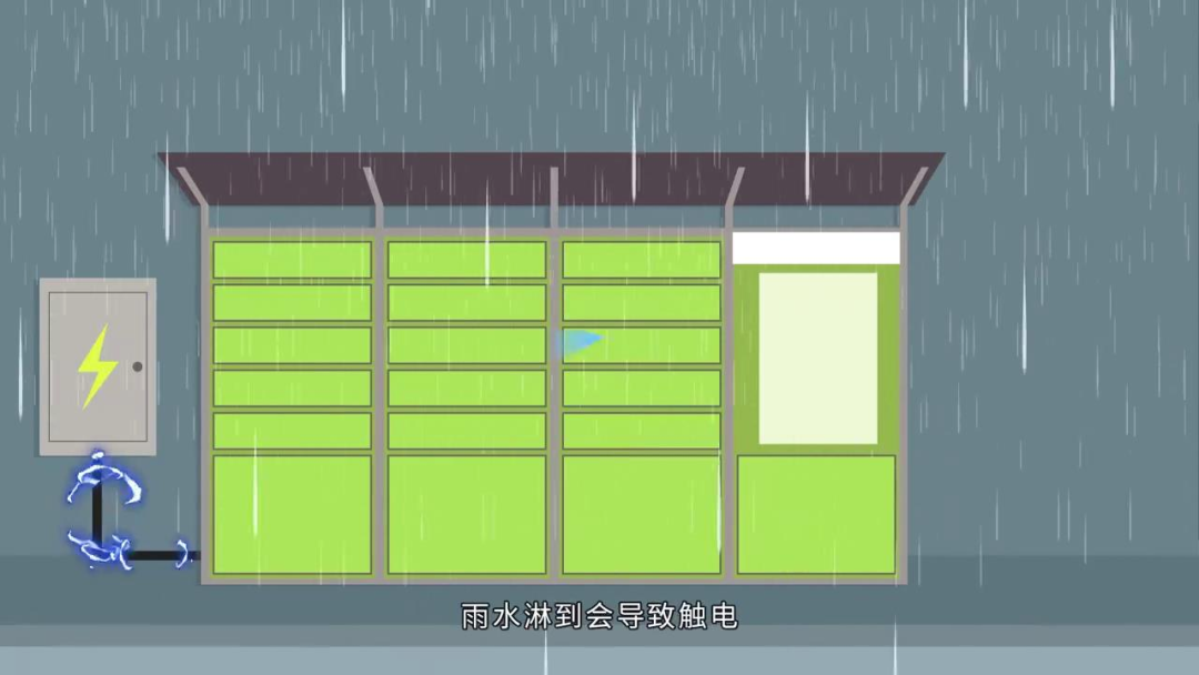 雷雨时接通电源的快递柜可能存在安全隐患,雨水淋到会导致触电。