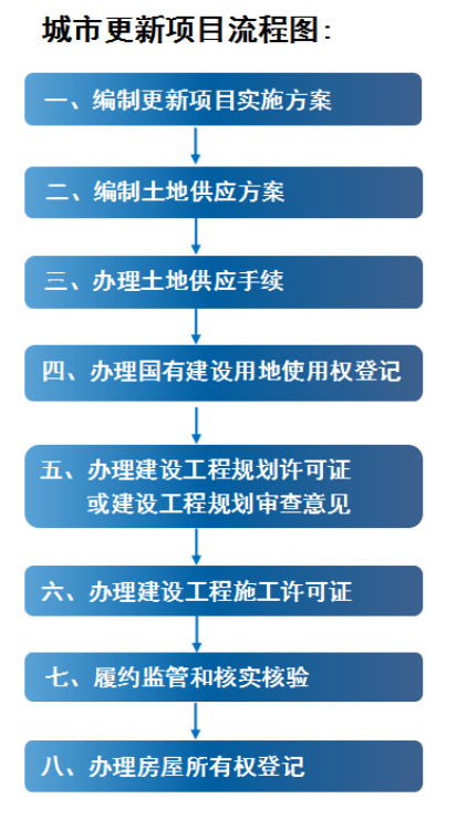 答案:城市更新项目的办理包含城市更新项目实施方案审查、土地供应方案审查、办理项目供地手续、国有建设用地使用权首次登记、建设工程设计方案审查、建设工程施工许可证办理、规划核实和土地核验、不动产登记办理八个流程。