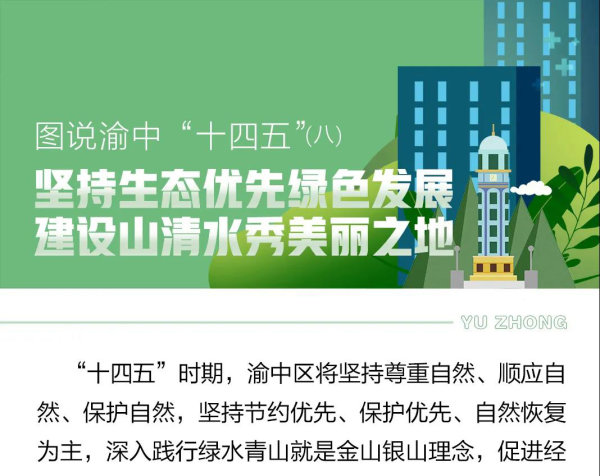 ——绿色发展全面加强。坚持筑牢绿色本底,推动生产空间集约高效、生活空间宜居适度、生态空间山清水秀,绿色发展形象更加凸显。山水渝中更富神韵,鹅岭等山脊线保护提升,朝天门等滨江片区治理提升启动实施,10余条山城步道、10余个城市阳台建成投用,“两江四岸”夜景灯饰璀璨提升。生态渝中更具底气,打赢污染防治攻坚战,“河长制”“禁渔令”全面落实,蓝天、碧水、净土三大环保战有力推进,“无废城市”试点、垃圾分类广泛实施,绿化覆盖率保持40%以上,“两江”渝中段水质稳定保持Ⅲ类以上,空气质量优良天数达315