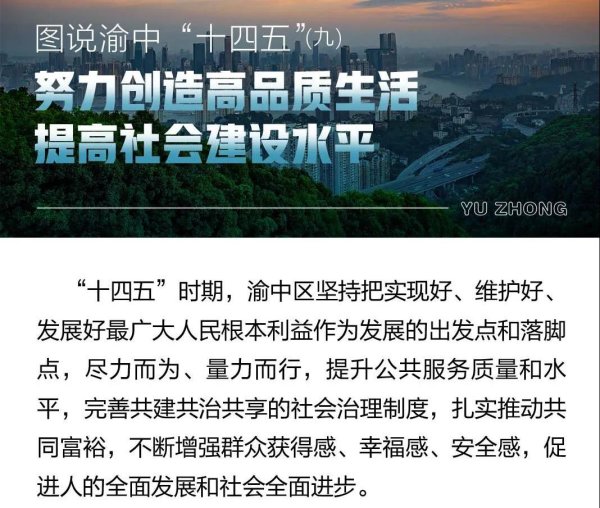 ——人文渝中深入建设。坚持保护用好“母城”历史文化资源,人文渝中、网红渝中持续升级,国家全域旅游示范区、国家文化和旅游消费示范城市成功创建。文物保护利用扎实推进,完成文物维修工程50余处,保护修缮历史建筑10余处,新建博物馆、陈列馆等8个。风貌街区协调打造,山城巷、白象街等5个项目开街运营,戴家巷、三层马路首开区等4个项目接近尾声,十八梯、鲁祖庙等10余个项目加快推进,10余个特色老社区全面建成,为城市塑形铸魂、增光添彩。全域旅游强力推动,机场城市候机楼、高铁城市候车厅正式运营,WFC观景台、来福士水晶连廊、李子坝观景平台等建成投用,洪崖洞、长江索道等景区景点提档升级,“山水游”“都市游”“文化游”持续升温,获评“全国十大全域旅游目的地”。