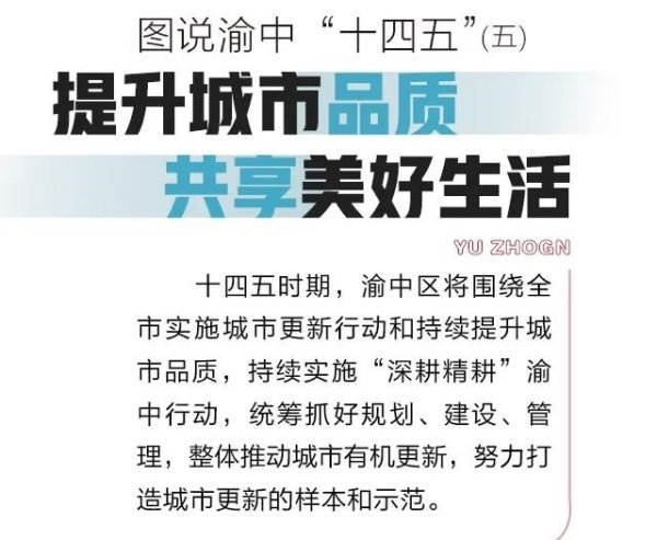 ——城市品质显著提升。坚持深耕精耕城市空间,城市品质和品位不断提升。四大功能板块协同发展,解放碑—朝天门一体化发展迈出坚实步伐,历史文化街区整体建设,大石化新区崛起发力,电创园持续调整升级,陆海国际中心等高端载体加快建设,菜园坝等市场群平稳搬迁,重庆来福士等150万平方米载体投用,解放碑获批全国示范步行街,大坪成为百亿级商圈。基础设施加快完善,高铁、轨道、桥梁、隧道等交通项目有序实施,曾家岩大桥等陆续投用,新增停车位逾1.5万个。坚持大城细管、众管、智管,全面推行“五长制”“门前三包”责任制,常态化开展“马路办公”,综合实施城市管理“七大工程”,市容环境干净整洁有序。