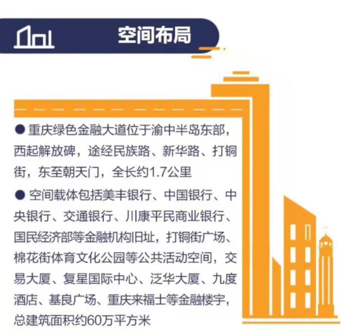 重庆绿色金融大道位于渝中半岛东部,西起解放碑,途经民族路、新华路、打铜街,东至朝天门,全长约1.7公里。空间载体包括美丰银行、中国银行、中央银行、交通银行、川康平民商业银行、川盐银行等金融机构旧址,打铜街广场、棉花街体育文化公园等公共活动空间,交易大厦、复星国际中心、泛华大厦、九度酒店、基良广场、重庆来福士等金融楼宇,总建筑面积约60万平方米,是重庆金融历史发源地、金融产业集聚地,也是重庆绿色金融创新发展核心区。