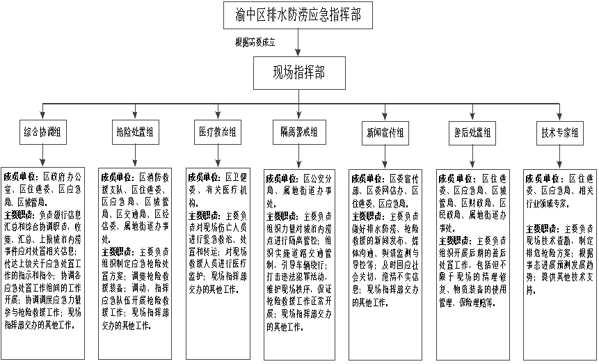 根据城市内涝事件应急处置需要,区排水防涝应急指挥部视情况设立现场指挥部,统一指挥现场城市内涝的应对处置工作。现场指挥部实行指挥长负责制,由指挥长负责现场处置工作的组织指挥。根据救援需要,现场指挥部下设综合协调组、抢险处置组、医疗救治组、隔离警戒组、新闻宣传组、善后处置组、技术专家组等。