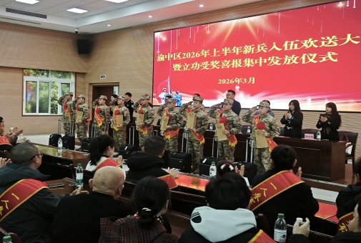 全体新兵身披绶带、胸戴红花、整齐列队、精神抖擞,面向军旗庄严宣誓,尽显渝中儿女献身国防的如山信念和昂扬斗志。军地领导在讲话中向光荣入伍的新兵表示热烈祝贺,向立功受奖军人及家属致以崇高敬意,勉励新兵牢记家乡人民嘱托,把满腔热忱淬炼为强军实践,以过硬本领书写无悔青春。仪式现场还为近期荣立三等功以上的渝中籍现役军人家庭集中颁发了立功喜报和慰问金,让军人军属共享荣光时刻,把尊崇之光转化为强国兴军的磅礴动力。