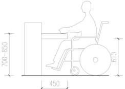 7.2.6 服务活动用房内应设低位服务设施,低位服务设施上表面距地面高度应为700mm~850mm,底部应留出高650mm、深450mm供乘轮椅者膝部和足尖部的移动空间,并宜配置助听器和放大镜。